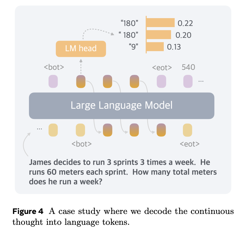 圖 4 展示了一個由 Coconut(c=1)解決的數學應用題案例研究。第一個連續思維可以解碼為「180」、「180」(帶空格)和「9」等 token。這個問題的推理過程應該是 3×3×60=9×60=540,或 3×3×60=3×180=540。