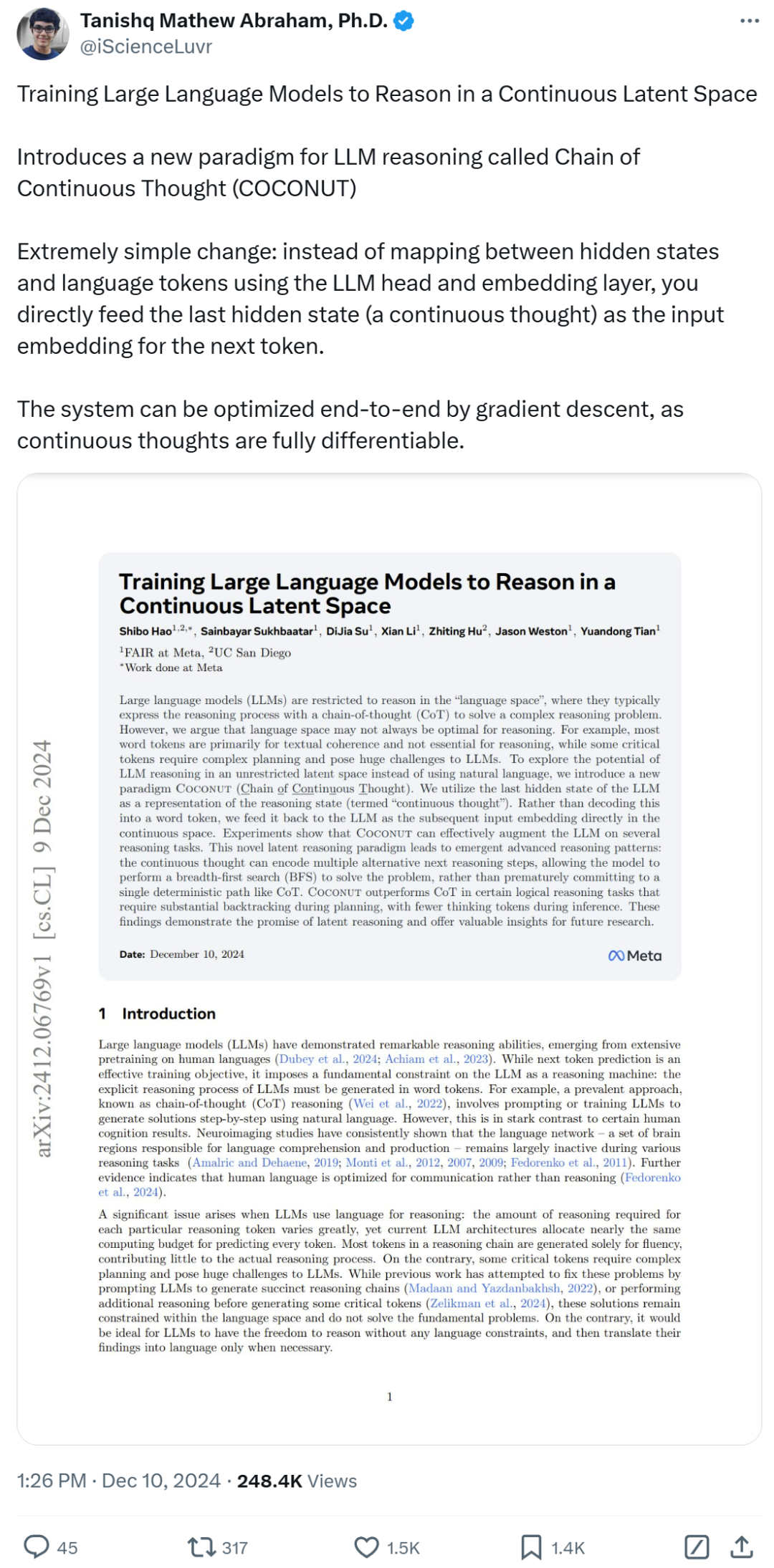 論文標題:Training Large Language Models to Reason in a Continuous Latent Space