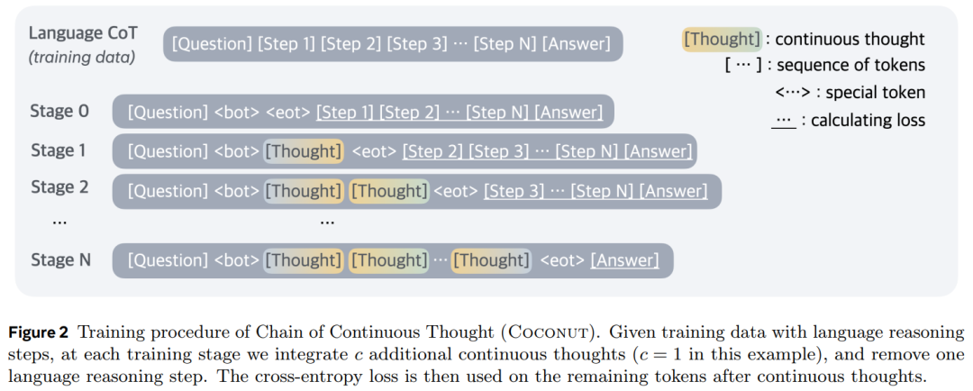 訓練。本文專注於問題 – 解決設置,其中模型接收問題作為輸入,並通過推理過程生成答案。作者利用語言 CoT 數據來監督連續思維。如圖 2 所示,在初始階段,模型在常規 CoT 實例上進行訓練。在後續階段,即第 k 階段,CoT 中的前 k 個推理步驟被替換為 k × c 個連續思維,其中 c 是一個超參數,用於控制替換單個語言推理步驟的潛在思維的數量。