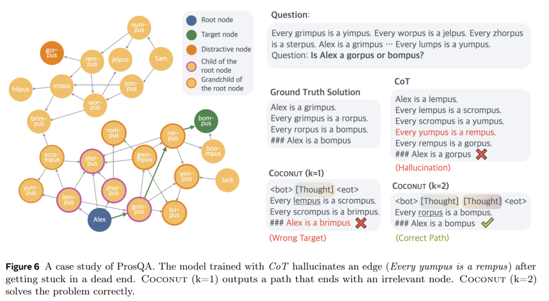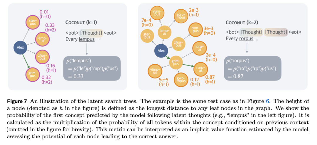 由於連續思維可以編碼多個潛在的下一步,潛在推理可以被解釋為一個搜索樹,而不僅僅是推理「鏈」。以圖 6 為例,第一步可以選擇 Alex 的任一子節點:{lempus, sterpus, zhorpus, grimpus}。
