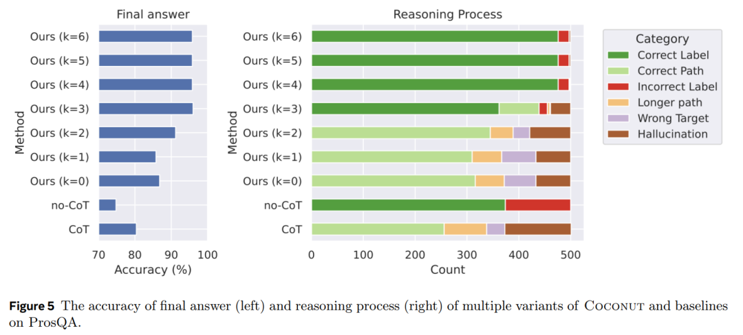 圖 5 展示了在 ProsQA 上對不同推理方法的對比數析。隨著更多的推理在連續思維中進行(k 值增加),最終答案的準確率(圖 5 左)以及正確推理過程的比例(圖 5 右中的 Correct Label 和 Correct Path)都得到了提高。此外,幻覺(Hallucination)和錯誤目標(Wrong Target)的發生率也下降。這也表明,當更多的推理髮生在潛在空間中時,模型的規劃能力得到了提升。