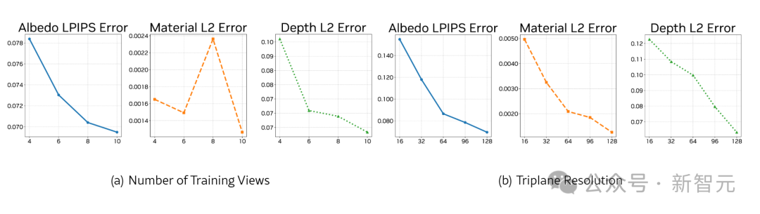 受模型隨視點數量擴展的啟發,研究者進一步研究訓練視點數量是否影響重建質量。他們使用固定的8視圖設置評估模型,其中模型使用4、6、8和10個視圖進行訓練。