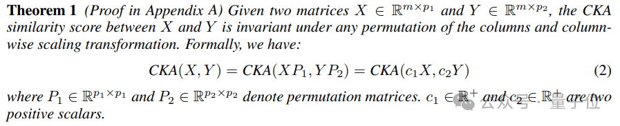 通過下面的定理1,論文在理論上證明了CKA相似度在任何列排列和縮放變換下具有不變性。同時,CKA能夠在不同維度的表徵之間建立對應關係。