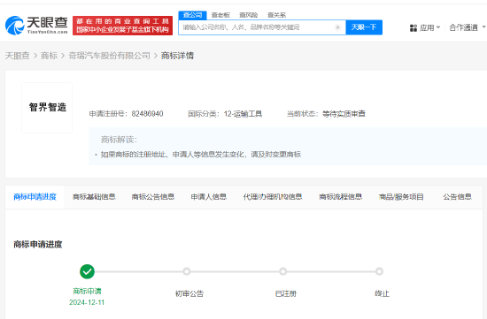 新浪科技訊 1月2日下午消息,天眼查知識產權信息顯示,近日,奇瑞汽車股份有限公司申請註冊一枚“智界智造”商標,國際分類為運輸工具,當前商標狀態為等待實質審查。