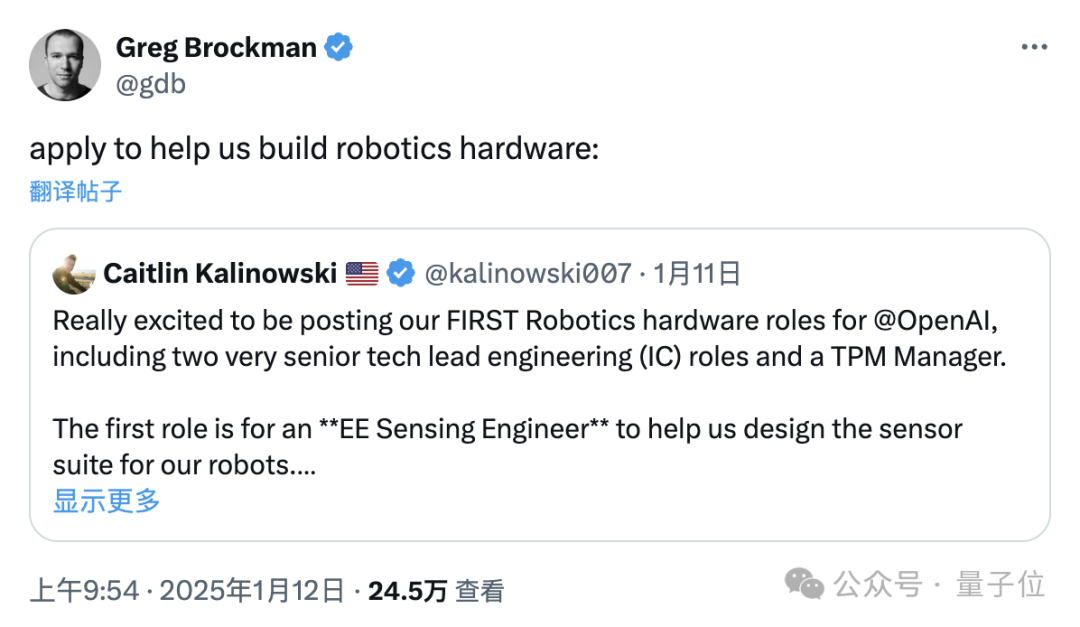 總裁Brockman轉發了一則招聘公告,招募機器人硬件工程師。