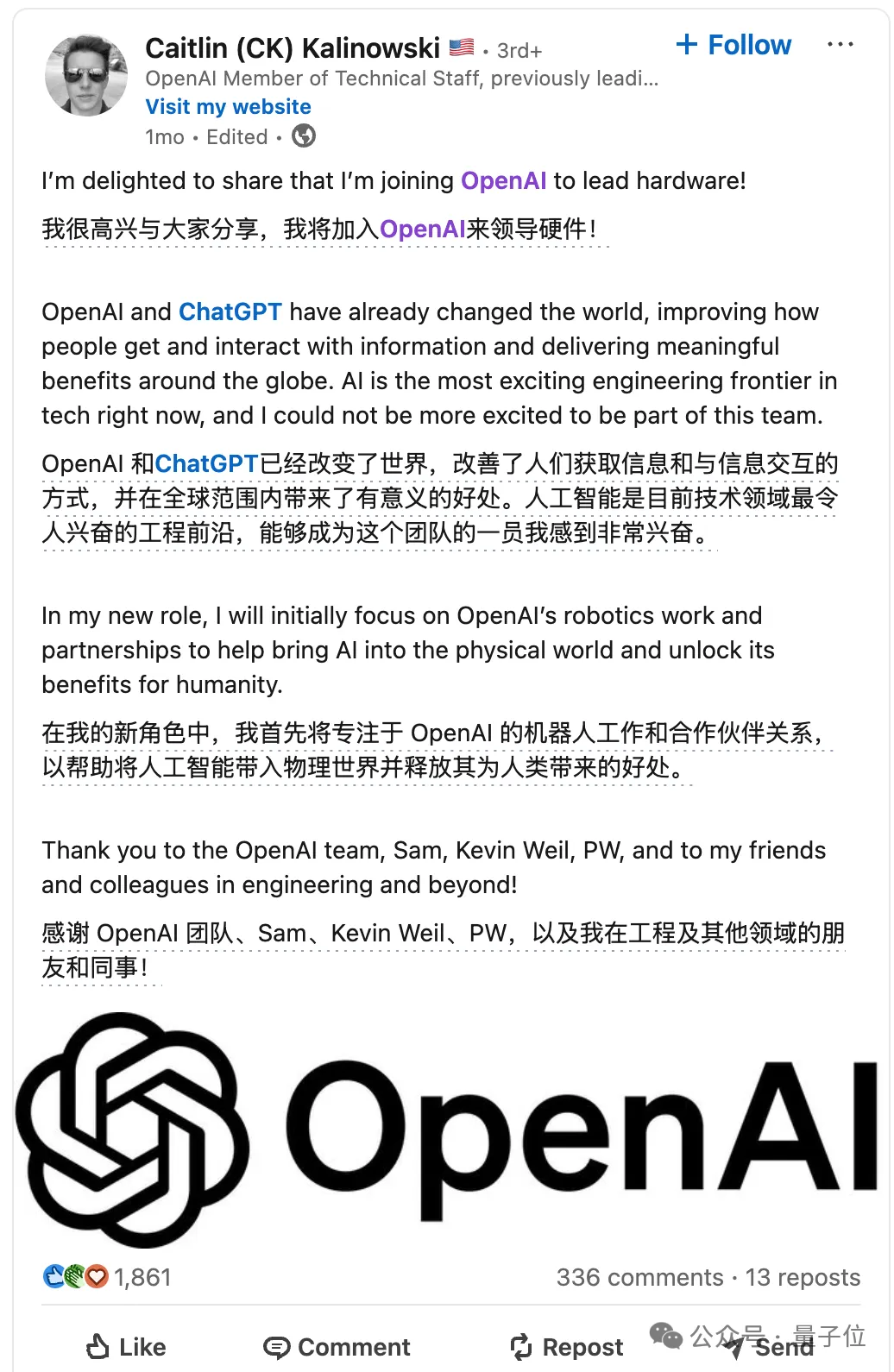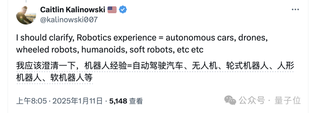 最早在X上發佈公告的是Caitlin Kalinowski,原來是Meta機器人和消費硬件團隊負責人,去年11月剛被挖到OpenAI。