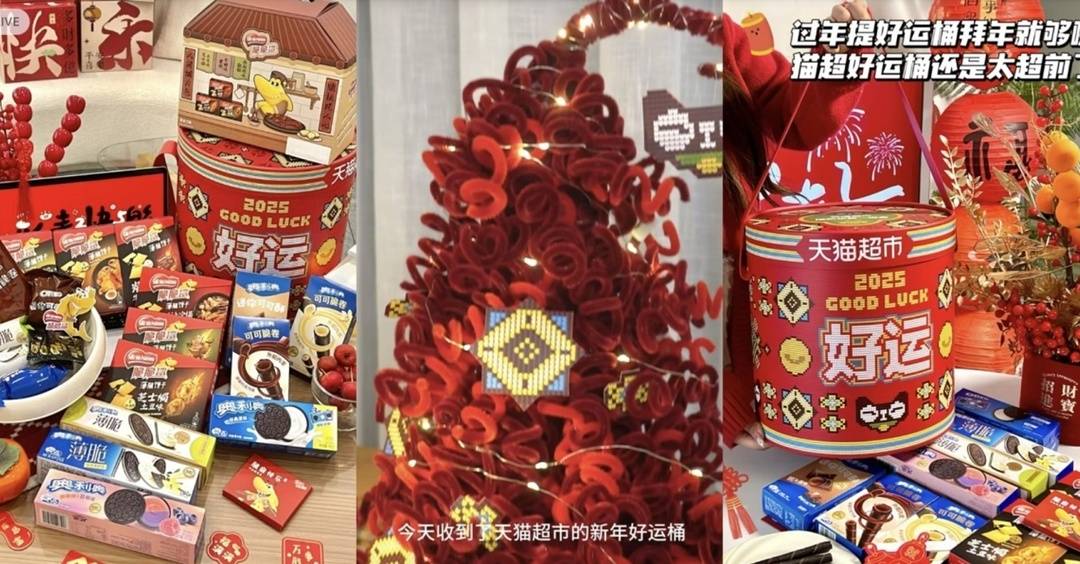 除了二次元聯名禮盒,一系列“好運”禮盒同樣受到00後的追捧。“不管東西怎麼樣,情緒價值先拉滿”是當下年輕人消費的一大趨勢。天貓超市數據顯示,良品鋪子抱一桶金巨型零食大禮包、奧利奧年年有餘燈籠禮盒、德芙發財大金塔好運禮盒在年貨節開賣後,銷量相比年貨節前增長了10倍,消費者在平台搜索“禮盒”超過100萬次。