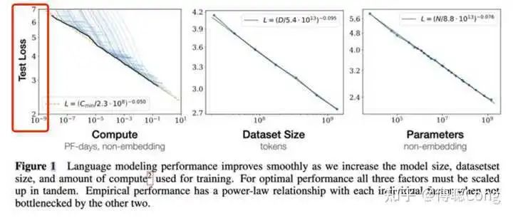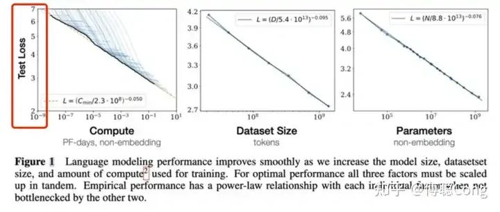 注意,這裏的縱坐標是test loss。也就是說,所謂的scaling能力,是對準「測試損失」這個指標的,所以理性地講,沒有人承諾過,隨著投入的數據、算力、參數的增加,模型的」智商「會線性提升。