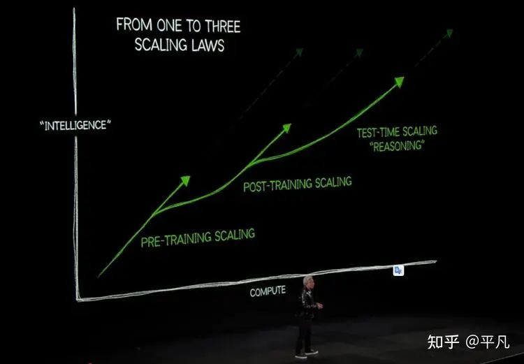 英偉達的黃仁勳在CES 2025上展示了一張PPT,標題為「從一種到三種Scaling Laws」,其縱坐標標註為智能程度(Intelligence),強調了人工智能發展過程中三種關鍵的Scaling Laws:預訓練(Pre-training)、後訓練(Post-training)和測試時推理(Test-Time Scaling)。