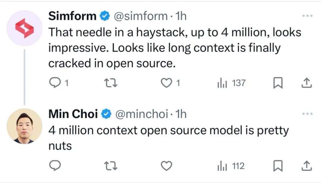答案是,一個追平了頂級模型能力、且把上下文長度提升到400萬token級別的新模型。