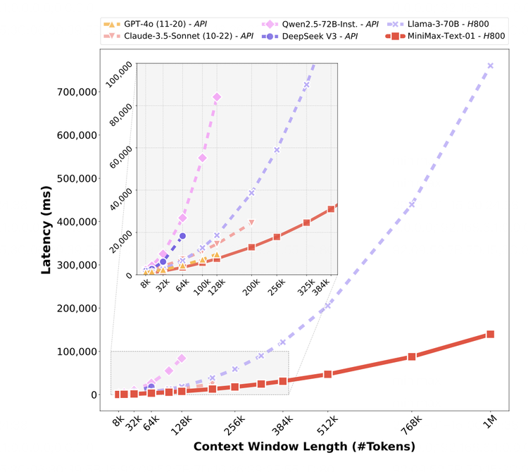 在MiniMax-01的性能報告里有這樣一張圖,從中可以看到,在其他模型處理256k的時間窗口內,MiniMax的模型可以處理多達 100萬個詞的信息。也就是說,即使模型一次只能專注於一部分內容,它仍然可以通過高效的計算策略和巧妙的設計,將更多信息納入整體理解。