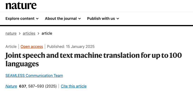 就在今天,權威科學期刊 Nature 報導了由 Meta 開發的開源多語言、多模態機器翻譯模型 SeamlessM4T,其突破性地實現了 100 多種語言在語音-語音、語音-文本和文本-語音方面的高效翻譯,為全球語言溝通帶來了新的可能。