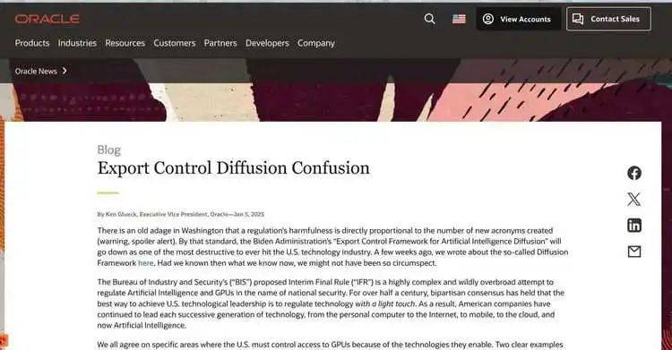 Ken Glueck(肯·格盧基)在博客中批評「最終規則」可能成為美國科技行業歷史上最具破壞性的政策之一,「美國國會此前價值2800億美元《芯片法案》的成果正在付諸東流,這一規則(IFR)將使美國公司的全球芯片市場萎縮80%,拱手讓給中國的競爭對手。」甲骨文稱「最終規則」冗長繁瑣,將帶來巨額合規成本,「會從流程上根本改變全球數據中心部署的經濟性。」