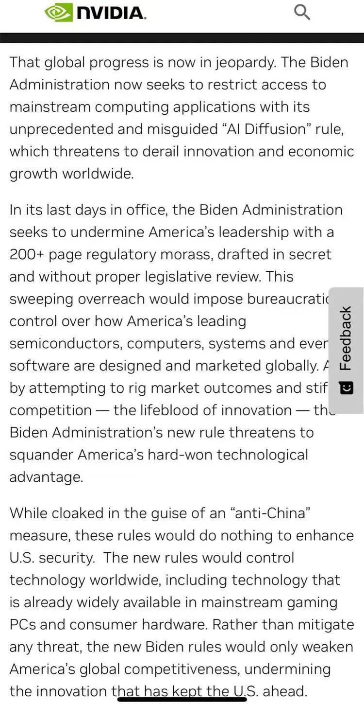 他還表示,「新規將在全球範圍內控制技術,包括已經廣泛應用於主流遊戲PC和消費硬件的技術。」他試圖用長文敦促拜登政府不要在特朗普政府接任前推出這項政策。