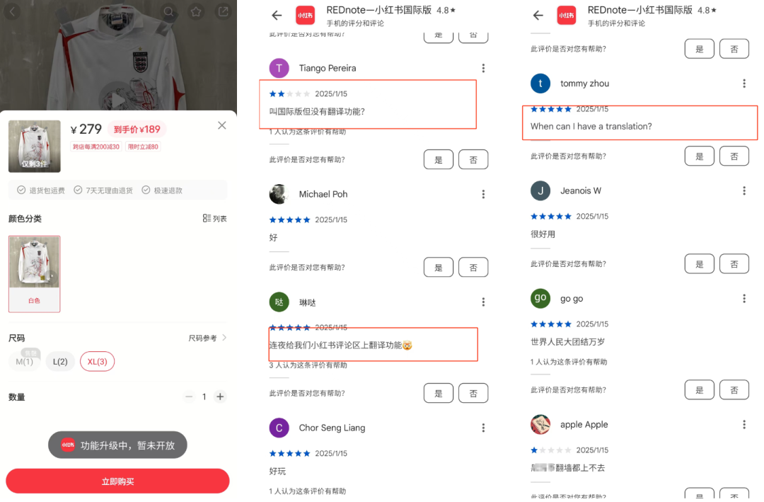 小紅書的國際版叫做REDnote,雖然叫國際版但主要面對的群體是海外華人,很多功能都沒有上線,比如國際版APP必備的翻譯功能,甚至連購物功能REDnote都沒開通。