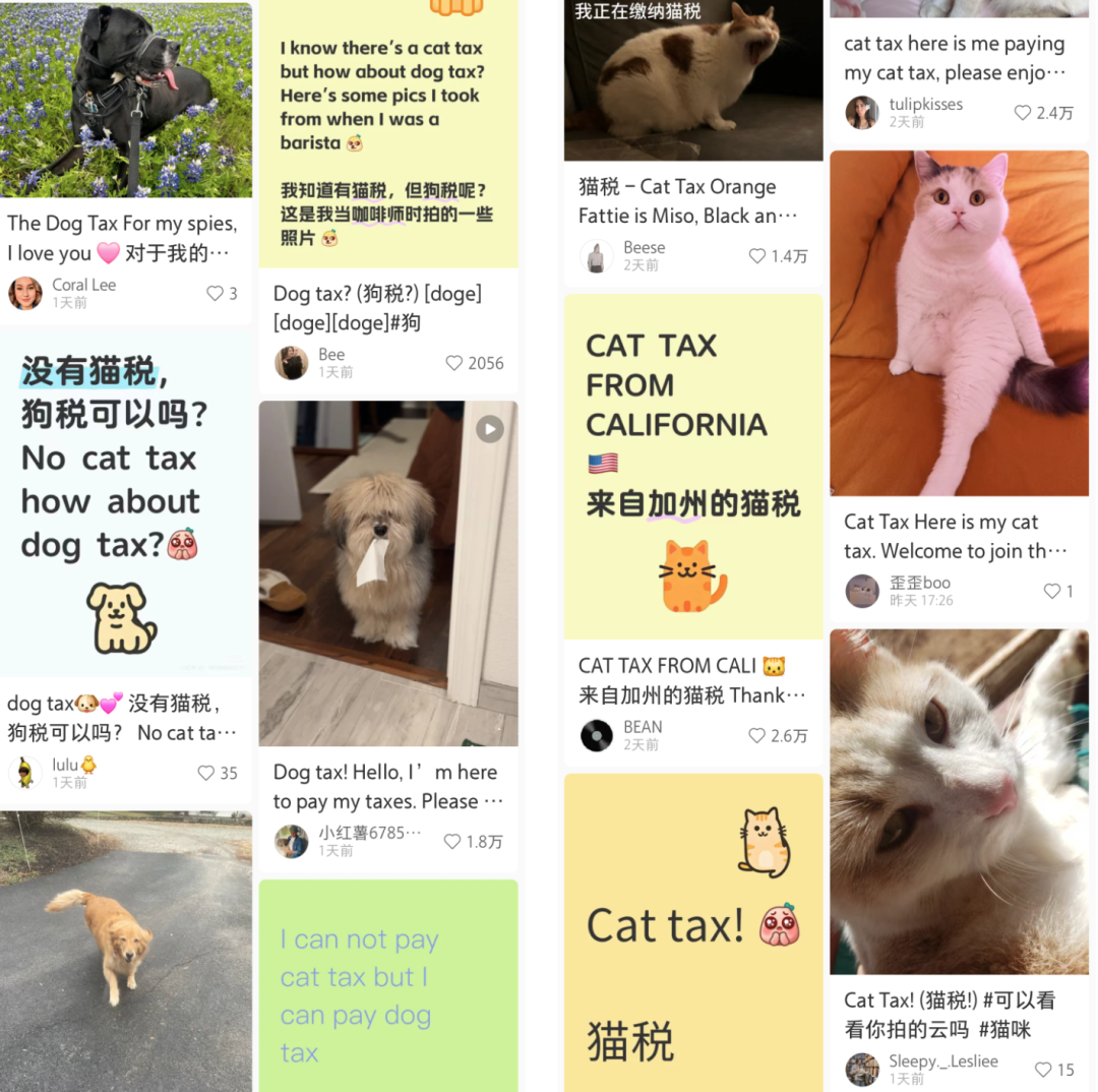 其次,小紅書用戶的造梗能力非常強大,一天不到的時間就找到了中外網民都沒法拒絕的內容——貓,並製造了一個熱梗:貓稅(cat tax)