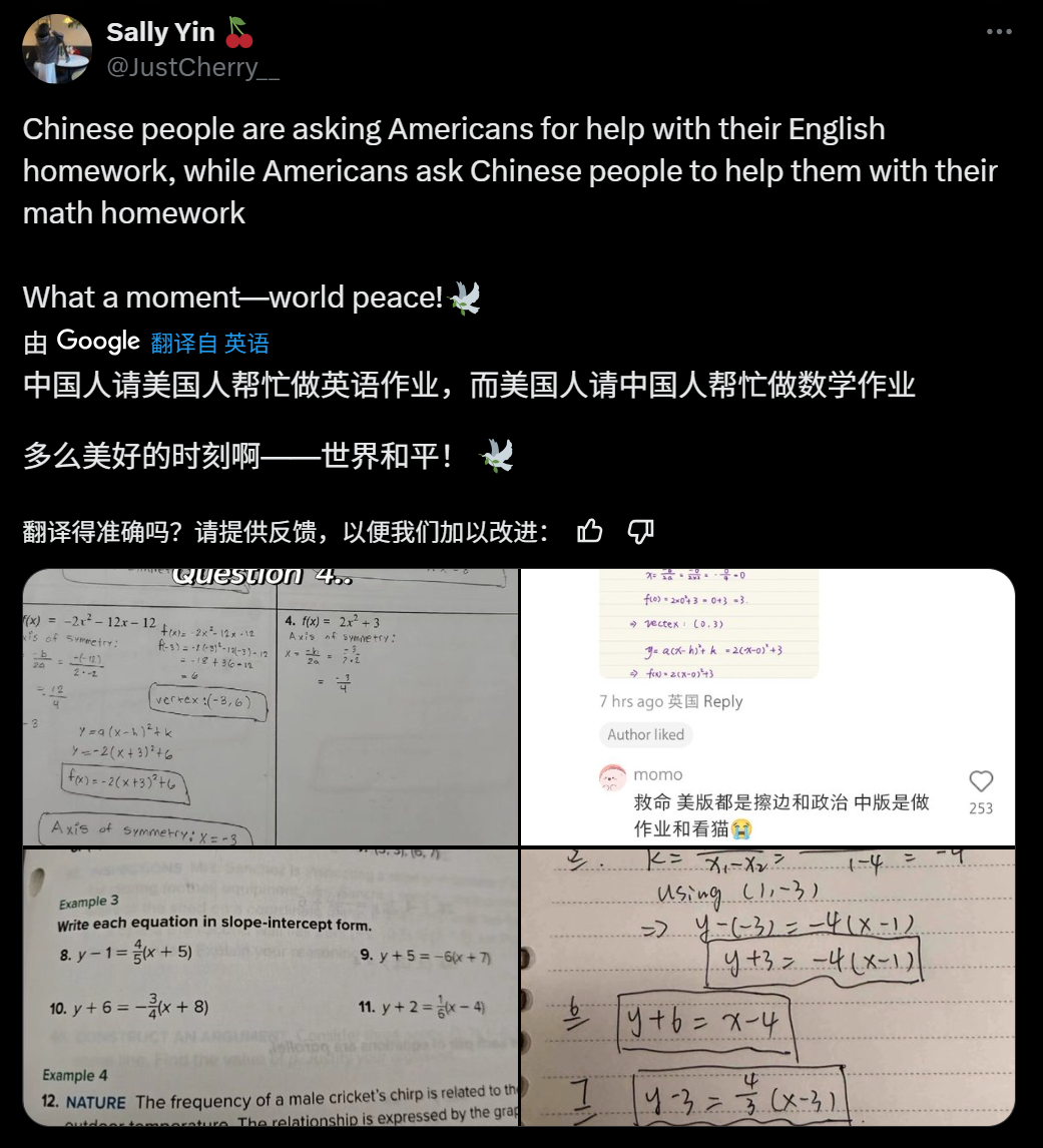 在小紅書上,外國網民憑藉先天優勢幫助中國網民解決英語作業,並且藉機處理一下自己的數學作業。