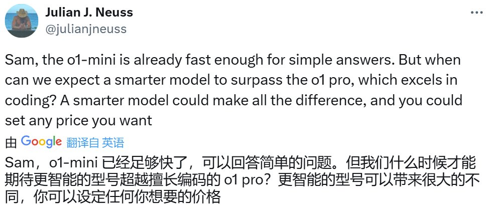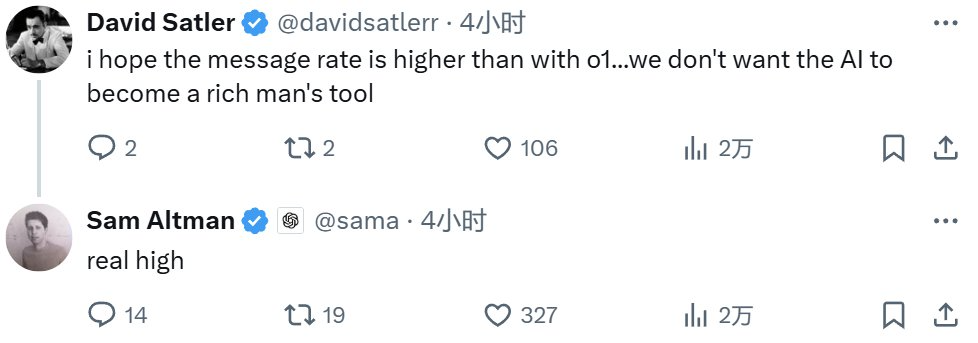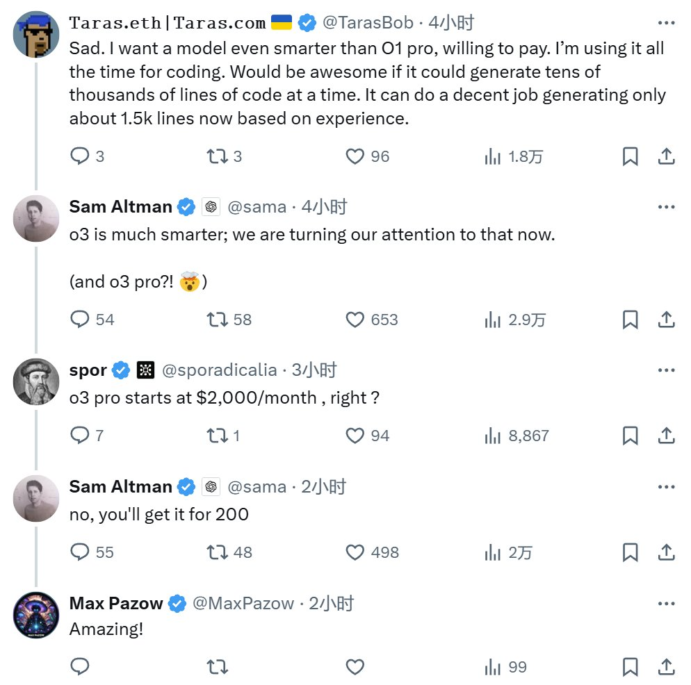 或許是為了安撫大家的情緒,奧特曼又抬出了 o3,表示這個版本會比 o1-pro 聰明得多,更別提 o3-pro 了。同時,他也表示 o3-pro 的定價不會是一個月 2000 美元起,200 美元的 Pro 訂閱者應該就能獲得一定的使用額度。
