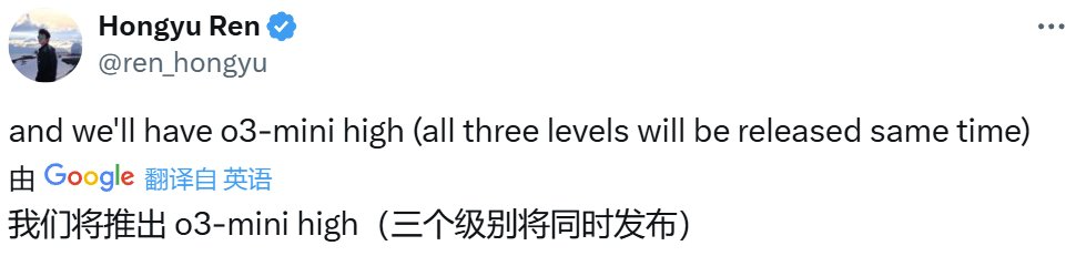 另據 OpenAI 研究科學家 Hongyu Ren 透露,他們會同時發佈 o3-mini 的 high、medium、low 三個版本。
