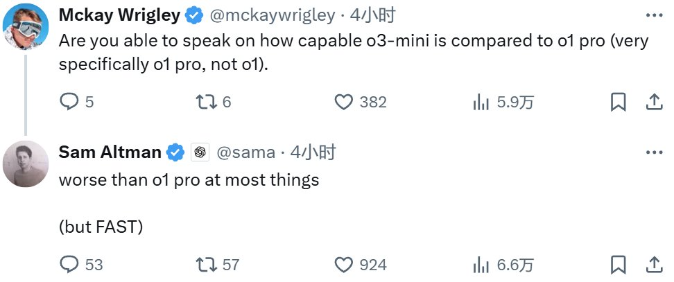 首先,奧特曼證實 o3-mini 的性能表現會遜於 o1-pro,但速度會更快。