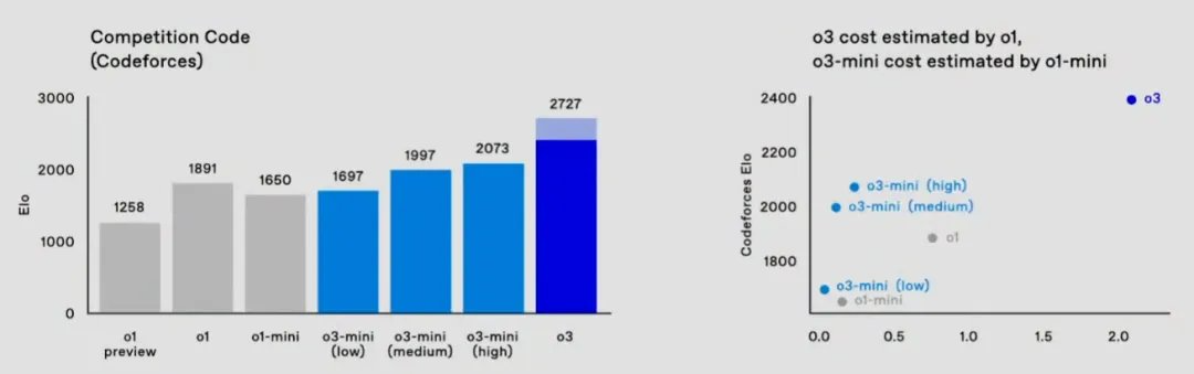 但其實,OpenAI 此前就已經公佈過相關基準數據了,所以這一點倒並不讓人驚訝。比如在 Codeforces 編程基準上,o3-mini (low) 性能不及 o1,high 版本會好一些,但整體都更具成本效益,這使其非常適合用來編程。