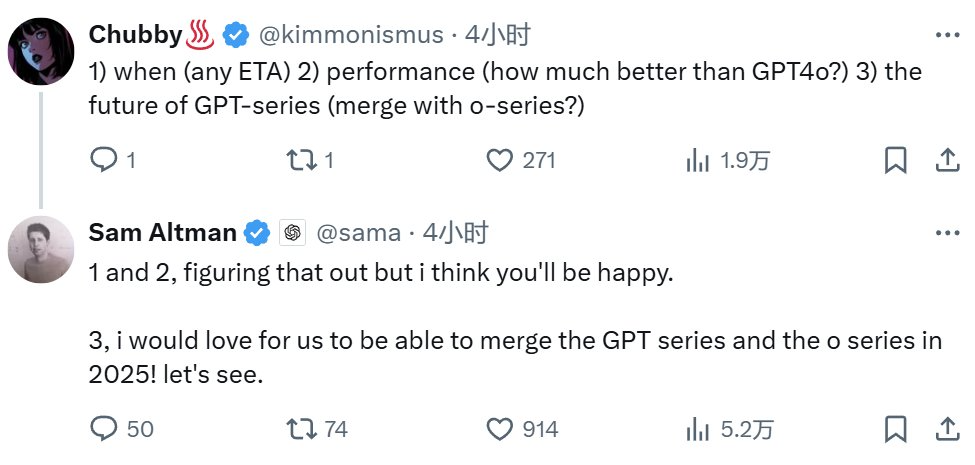 另外,奧特曼也談到了 GPT 系列與 o 系列模型品牌融合的問題。看起來,這個融合行動就將在今年發生!