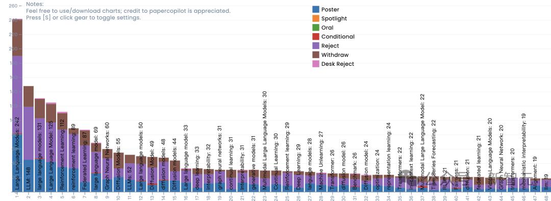 按照第一個關鍵詞計算,排名前10的關鍵詞中有一半都是大模型,包括Large Language Models以及縮寫、大小寫等不同變體。