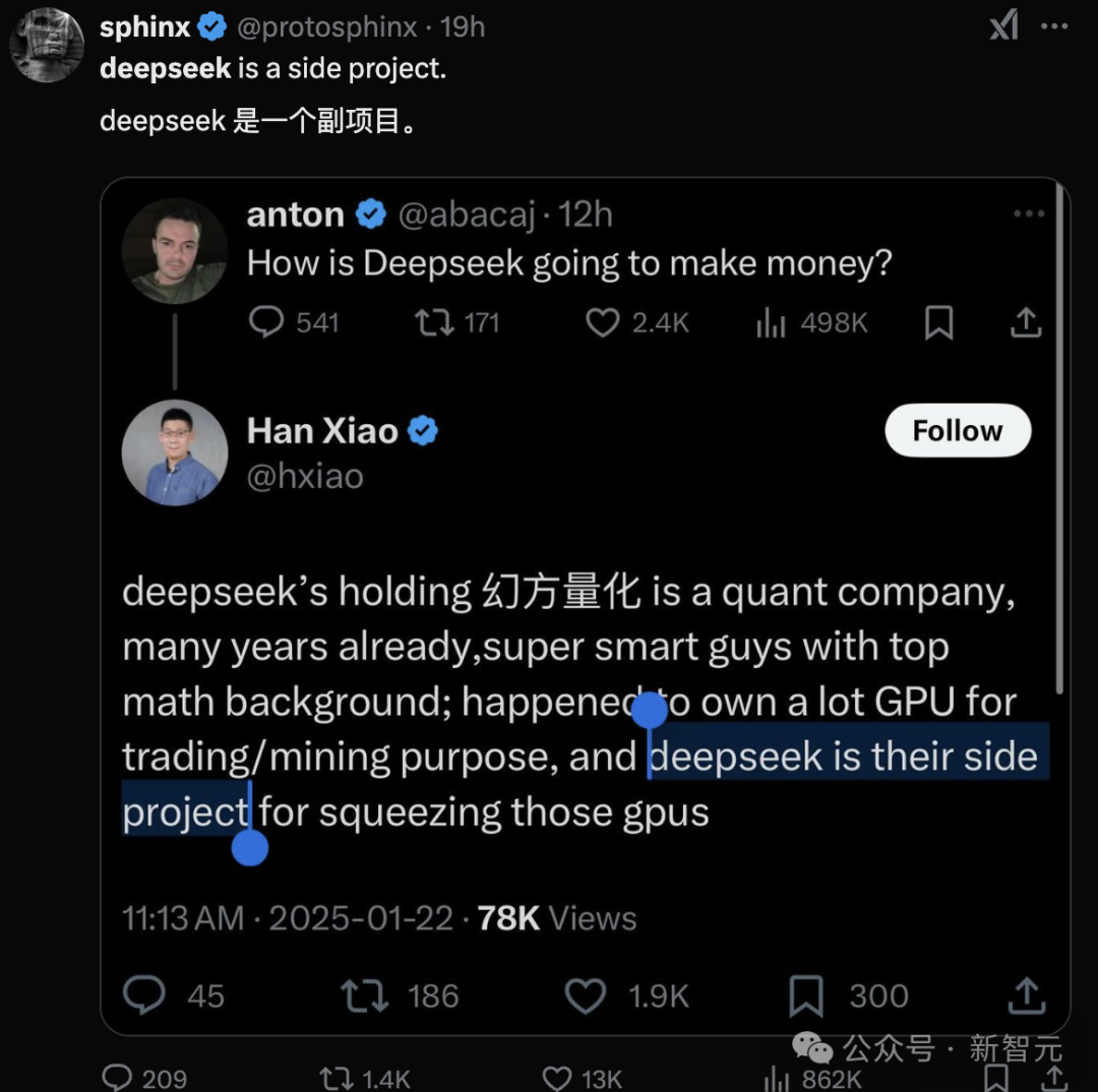 更有人曝料,DeepSeek還只是個「副項目」,主業根本不是搞大模型!