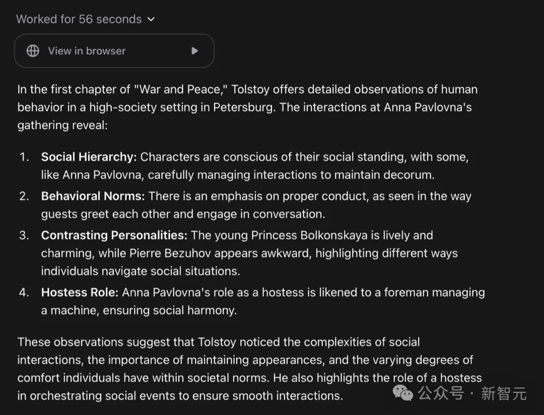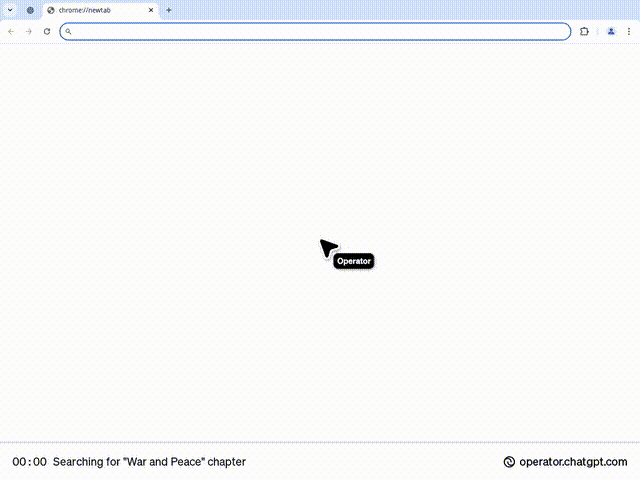 例如,可以讓 Operator 閱讀《戰爭與和平》的第一章,並總結每個角色的所有細節以及他們所展現的人類心理和行為。然後,Operator 在 Project Gutenberg 網站上找到了《戰爭與和平》並閱讀了第一章,做得非常出色。