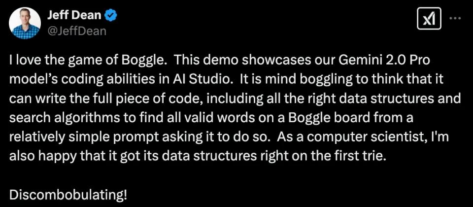 Google首席科學家、AI 大佬 Jeff Dean 盛讚了 Gemini 2.0 Pro 的編程能力。他在 X 上發貼稱對於 Gemini 2.0 Pro 編程能力感到驚訝。他表示:「我喜歡 Boggle 遊戲(一種填字遊戲)。這個演示展示了我們的 Gemini 2.0 Pro 模型在 AI Studio 中的編碼能力。令人難以置信的是,它可以通過一個相對簡單的提示,編寫出完整的代碼,包括所有正確的數據結構和搜索算法,以在 Boggle 遊戲板上找到所有有效的單詞。作為一名計算機科學家,我也很高興它第一次就正確地完成了數據結構。」 他還幽默地用了 「Discombobulating!」 (令人困惑 / 震驚)來形容。