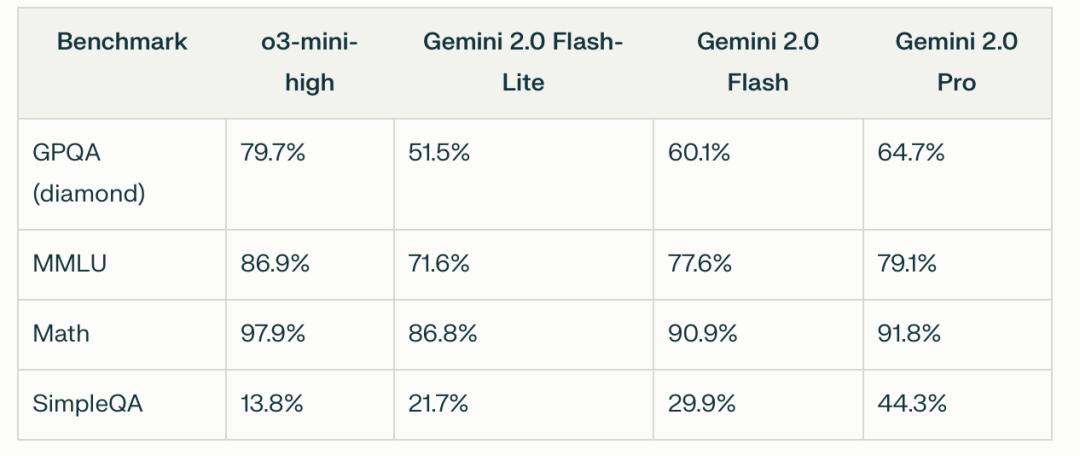 也有 X 用戶將 o3-mini-high、Gemini 2.0 Flash 和 Gemini 2.0 Pro 放在一起跑了幾個基準測試進行性能比較。