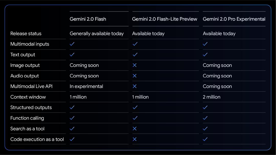 Flash 系列模型首度亮相於 I/O 2024 大會,作為一種強大的主力模型廣受開發者歡迎。Gemini 2.0 Flash 提供全面的功能,包括原生工具使用、100 萬個 token 上下文窗口和多模式輸入。它目前支持文本輸出,具有圖像和音頻輸出功能,並且計劃在未來幾個月內全面推出 Multimodal Live API。