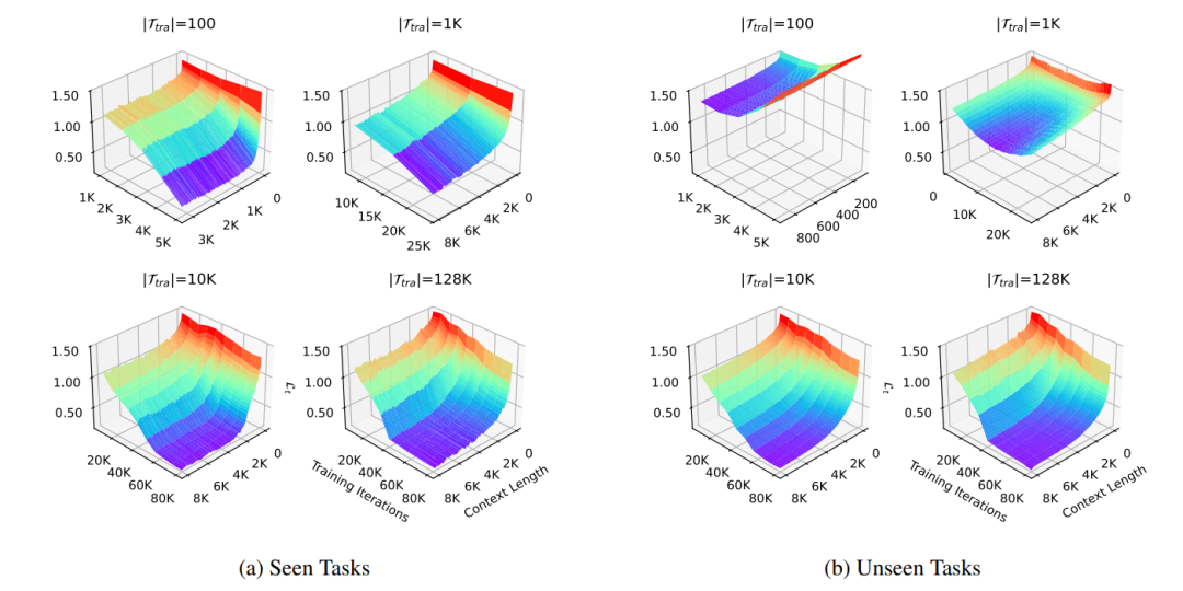 圖 3 相同數據量,不同任務量訓練的損失值(越低越好)和上下文長度以及元訓練迭代次數的關係。任務數量越多,在已見(seen)和未見(unseen)任務上的表現越一致,但在上下文維度上花費更長的下降時間。