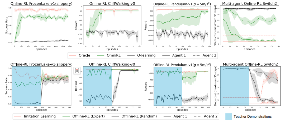 圖 2 展示了在隨機世界中訓練的 OmniRL 模型,僅通過上下文學習,不依賴於任何梯度優化,在冷啟動,或者預先給定一段演示軌跡(包括專家演示,以及較差的演示),能通過在線強化學習(Online-RL),離線強化學習(Offline-RL),模仿學習(IL)的自主切換,達到較好表現,證明上下文學習有巨大的靈活性。進一步,還能在演示的基礎上,進一步通過自主探索持續提升自身能力。