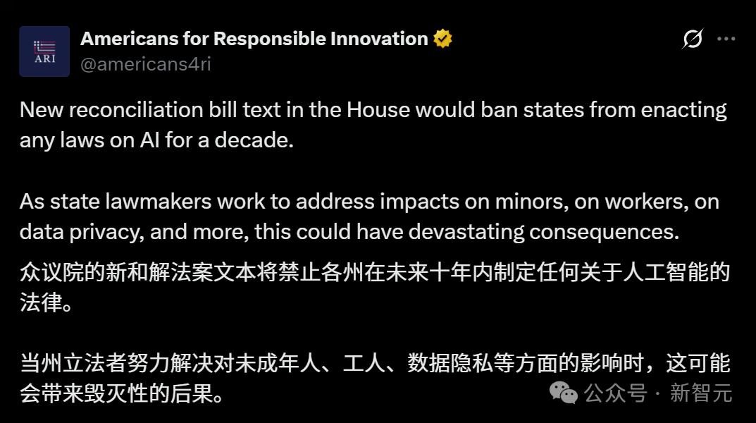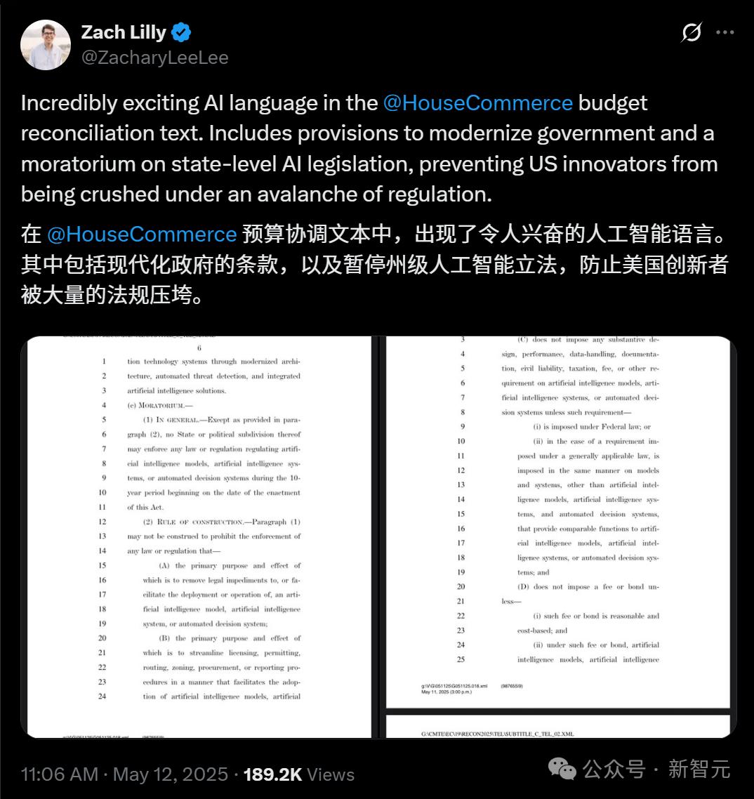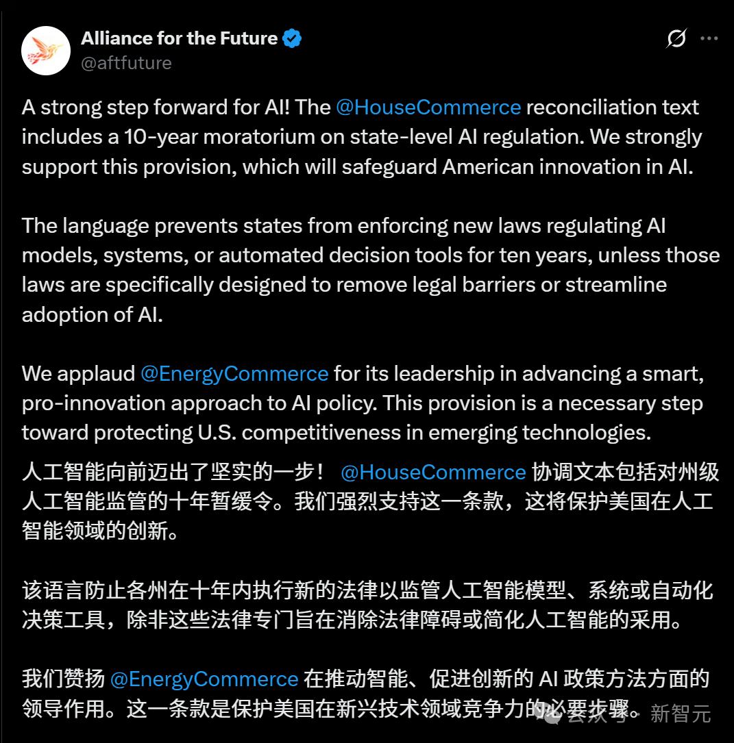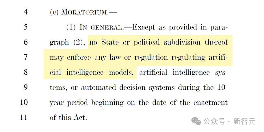 簡而言之就是,禁止聯邦和州層面的AI監管,為期十年。