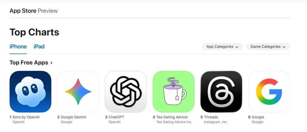 當地時間週五(10月3日),Sora App登頂蘋果美國「熱門免費應用」榜單。
