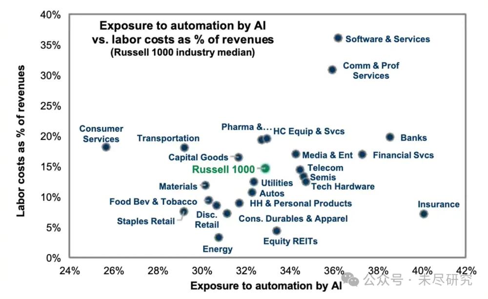 跟蹤美國前1000家上市公司的Russell1000指數成分公司,其中1/3已經對AI自動化敞口,涉及的人力資源佔收入的比重為15%。其中對AI敞口大、人力成本佔收入比重較大的行業(圖中綠點右上側),已經開始加快採納AI,如軟件服務業、傳播及專業服務機構首當其衝,還有銀行和金融服務業、媒體娛樂業、醫療服務業及製藥行業等。