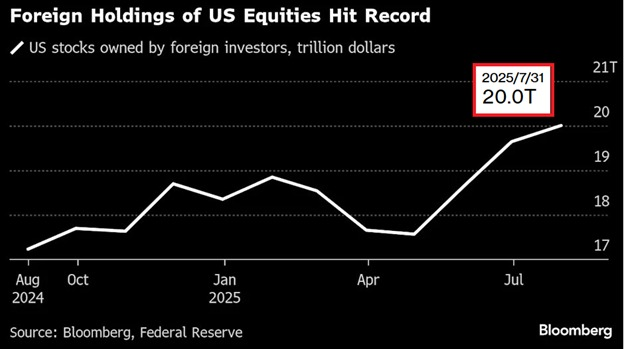 美國資本市場仍然起到了引領技術革命的作用,AI熱潮吸引了全球資本。外國投資者持有的美國股票已增至創紀錄的20萬億美元,過去幾個月增加了2.5萬億美元。目前,海外投資者持有約60萬億美元美國股市的約30%,這是自1945年以來的最高水平。