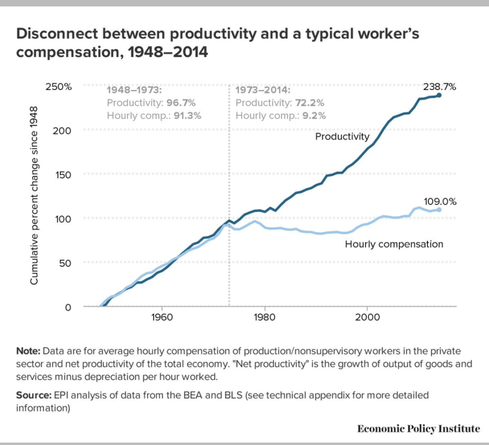 美國的勞動生產率提升,與勞動報酬之間的差距越來越大。它帶來的收入差距、財富差距越來越明顯。如果AI提升的生產力達到了讓全社會財富總量充裕的程度,那麼財富分配而不是創造,將成為未來經濟的核心問題。