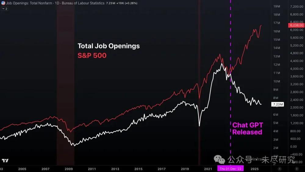 在這一張圖上可以明顯看出,自從ChatGPT發佈之後,標普500指數一路上揚,但這500家美國最大公司招聘的工作崗位卻在下降。