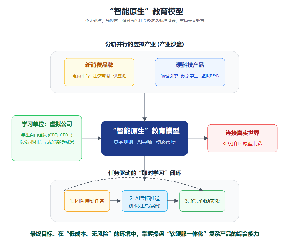 1. 分軌並行的虛擬產業:在早期階段將構建多個並行的、高度專業化的虛擬產業環境。例如,會有一個專注於「新消費品牌」的模擬世界,它內置了完整的電商平台、社交媒體營銷工具鏈和柔性供應鏈系統;同時,也會有一個專注於「硬科技產品」的模擬世界,它提供了先進的物理引擎、數字孿生接口和虛擬研發實驗室。每個「世界」都是一個自洽且高度仿真的產業沙盒,讓學生可以沉浸在特定領域的真實挑戰中。