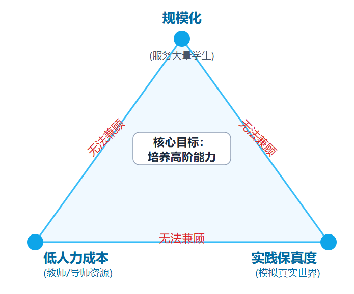 過去模式的核心是「教師授課-學生聽講-有限實踐」,它在知識傳遞上或許有效,但在培養上述高階能力時,卻陷入了一個「不可能三角」:教育的規模化、實踐的保真度和教師的人力成本。