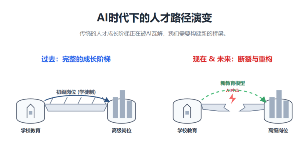 教育體系必須在校園內就讓學生完成過去需要在職場花費數年才能完成的「初級崗位實踐」,並在此基礎上,直接培養出具備整合、創新和領導能力的「準高級人才」。