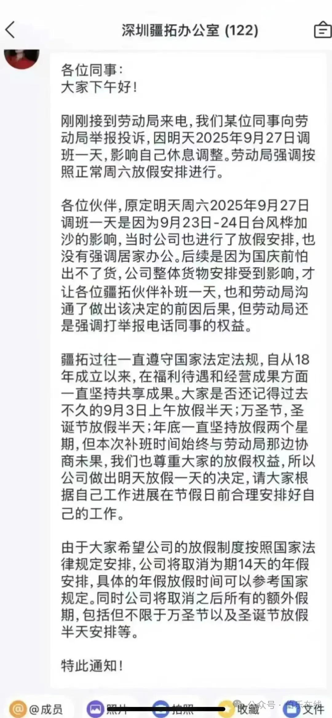 發佈通知的是深圳市疆拓商貿有限公司(以下簡稱「深圳疆拓」)。深圳疆拓發佈的通知稱,公司原定於 2025 年 9 月 27 日(週六)調班一天,以彌補此前因颱風「樺加沙」影響導致的放假安排。9 月 23 日至 24 日,受颱風「樺加沙」影響,公司曾安排放假,且未要求居家辦公。然而,隨著國慶假期臨近,公司為確保貨物及時發出,決定讓員工 27 日補班一天。