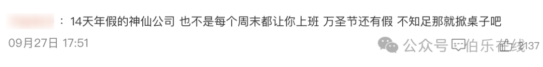 還有網民表示:「14 天年假的神仙公司,也不是每個週末都讓你上班,萬聖節還有假。不知足那就掀桌子吧。」
