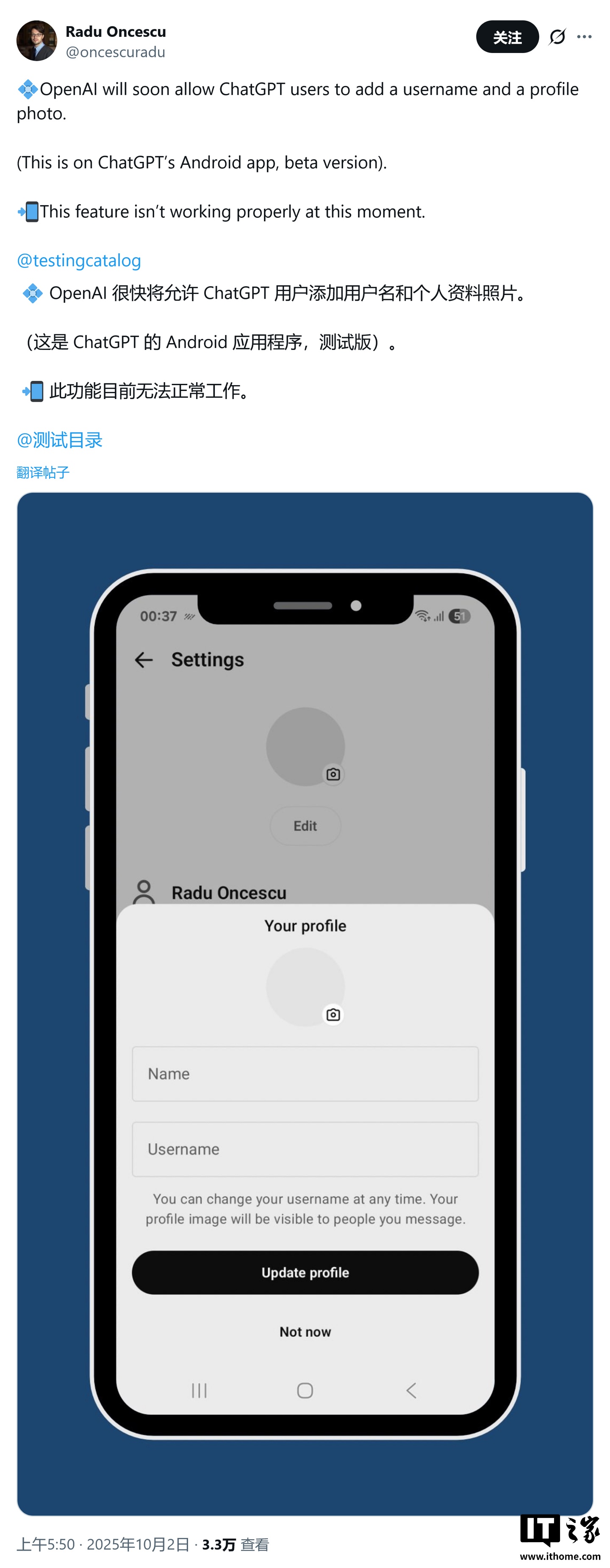 為了支撐該功能,OpenAI 正在同步開發一套完善的配套系統,包括支持用戶自定義的「用戶名」以及可上傳頭像的個人資料頁面。這意味著用戶未來將擁有專屬的身份標識,並能夠像使用其他社交應用一樣,搜索並聯繫平台上的其他用戶。