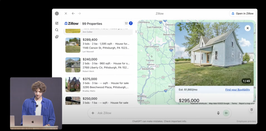 聊到要開店選址,ChatGPT會建議你去「匹茲堡」,並無縫地,為你喚醒Zillow(美國版鏈家),直接幫你篩選帶院子的三居室。