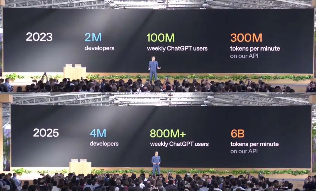 距離首屆開發者日僅兩年,OpenAI 的生態已經發生了翻天覆地的變化:開發者人數從 200 萬增加到 400 萬,ChatGPT 周活躍用戶從 1 億飆升至 8 億,而 API 每分鐘處理的 Token 數量更是暴漲 20 倍,達到了 60 億。
