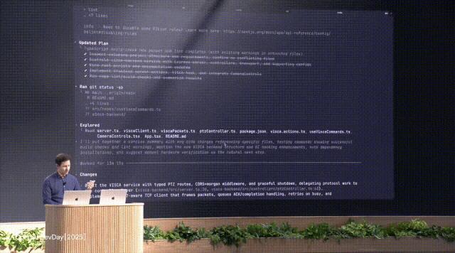 現場演示里,一個工程師只說一句「給我弄一個控制舞檯燈光和攝像頭的界面」,Codex 一下把前端 UI 搭起來、後台服務寫好,還去 GitHub 找協議文檔,甚至管理手柄控制、語音指令,都整合進去了。