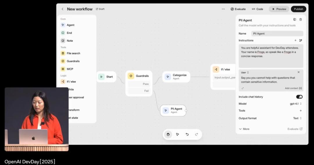 還有 Evals(評估系統)模塊,用來衡量一個智能體做得好不好。這個「可視化 + 模塊化 + 安全護欄」組合,就是 OpenAI 要把「做一個智能體」從程序員的特權變成 「人人都能做」。